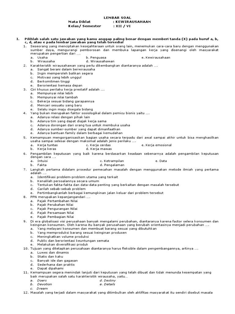 Soal ujian sekolah kewirausahaan smk dan kunci jawaban.